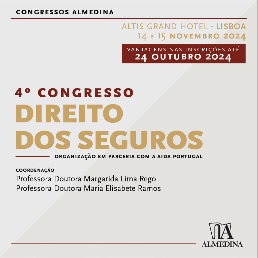 Nos dias 14 e 15 de novembro de 2024, realizou-se em Lisboa o IV Congresso Direito dos Seguros AIDA Portugal, organizado em parceria com a Almedina, sob a coordenação científica das Profas. Doutoras Margarida Lima Rego e Maria Elisabete Ramos.